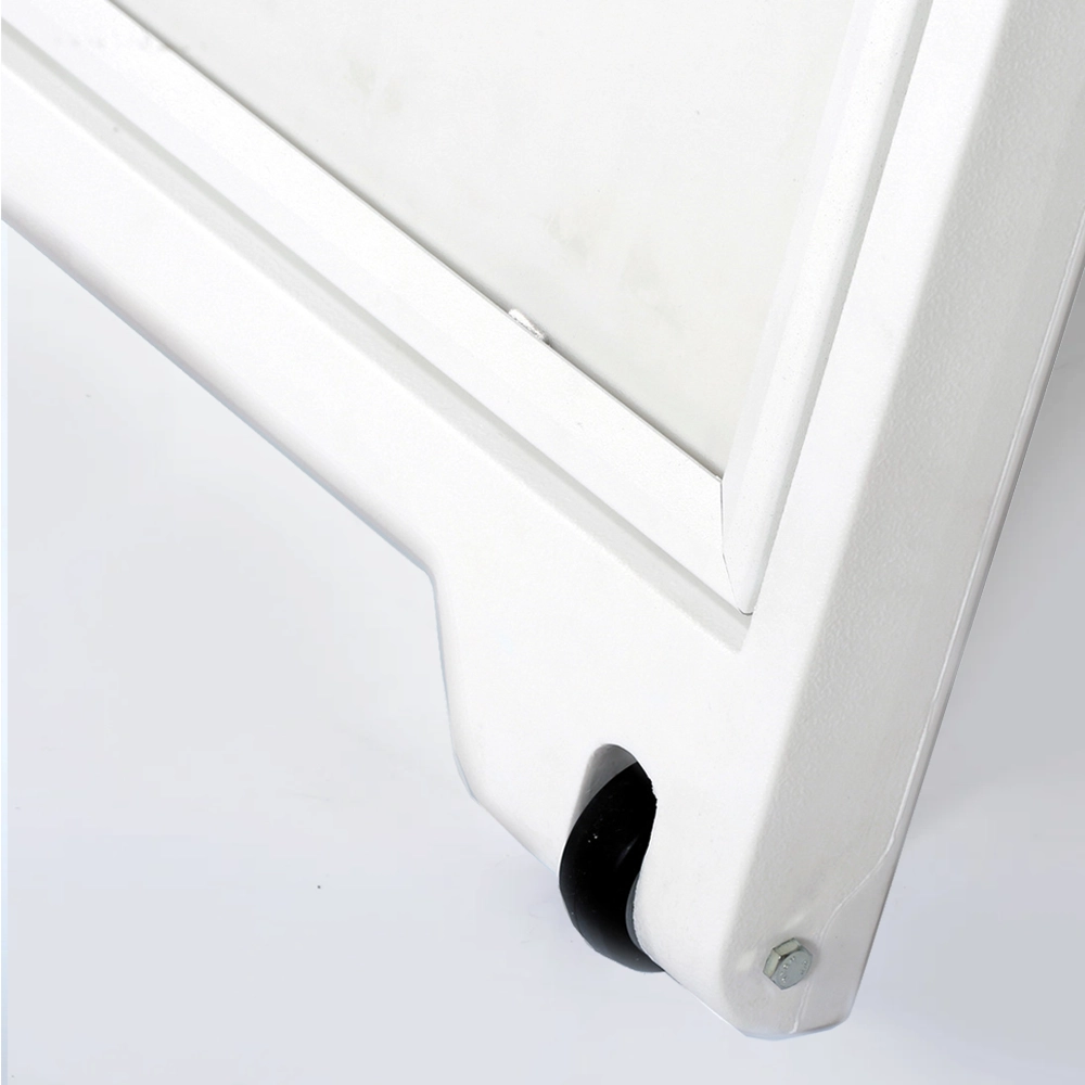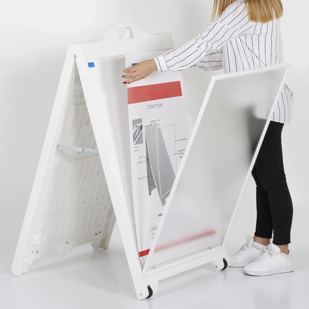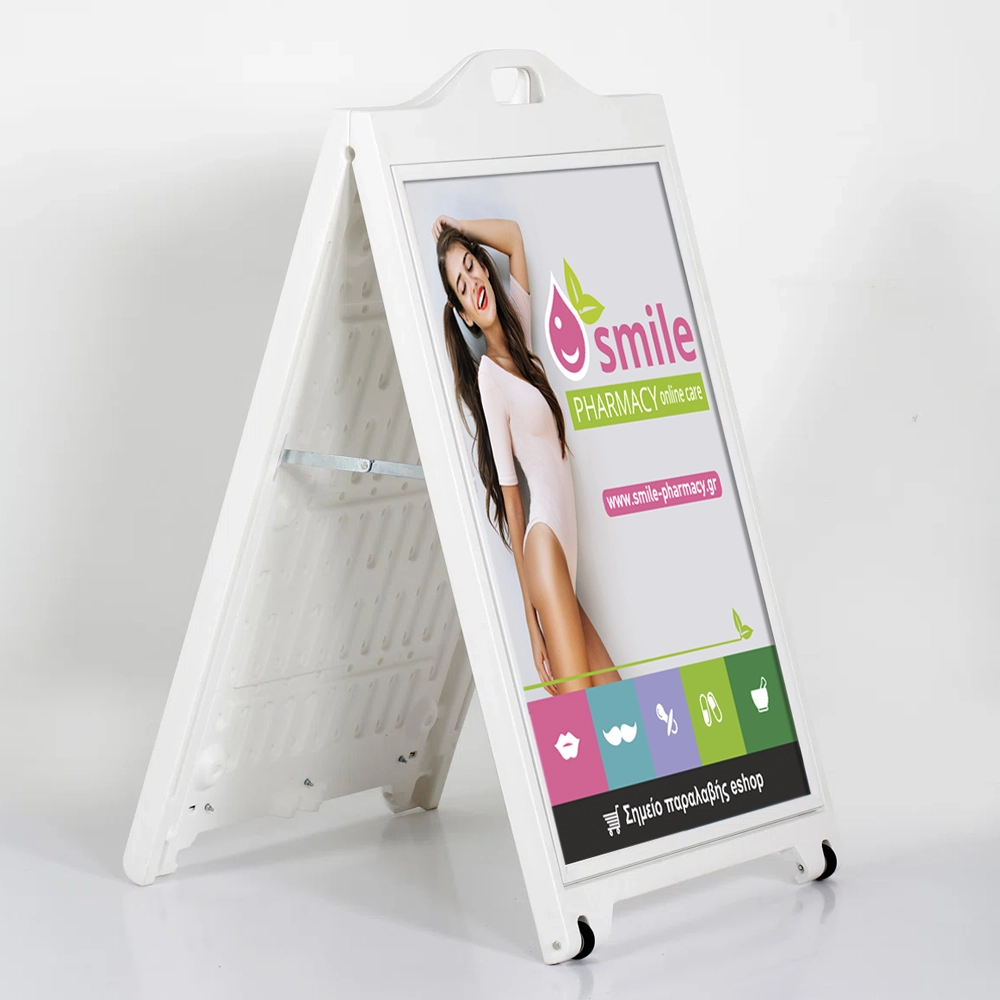 Το A–BOARD pvc σταντ με κορνίζα αλουμινίου είναι κατασκευασμένο από πλαστικό υψηλής ποιότητας HDPE*, είναι διπλής όψεως, πτυσσόμενο, με χειρολαβή και ροδάκια για εύκολη μετακίνηση. Aνθεκτικό, στιβαρό κατάλληλο για εκτεταμένη χρήση σε εξωτερικούς χώρους και σε αντίξοες καιρικές συνθήκες. Για την προστασία της εκτύπωσης διαθέτει κάλυμμα από κορνίζα αλουμινίου με αντιθαμβωτική διαφάνεια PET. Η εκτύπωση γίνεται επάνω σε μουσαμά, για την σταθερή τοποθέτηση της εκτύπωσης υπάρχει κολλητική ταινία (επαναχρησιμοποιούμενη μέχρι 100 φορές) που επιτρέπει και την εύκολη αλλαγή εκτύπωσης. Όταν δεν χρησιμοποιείται, διπλώνει για πιο άνετη αποθήκευση.