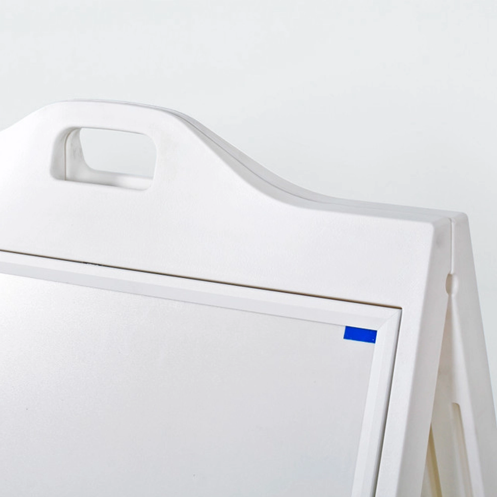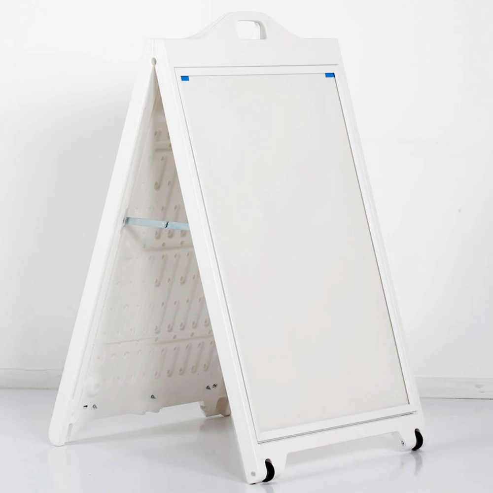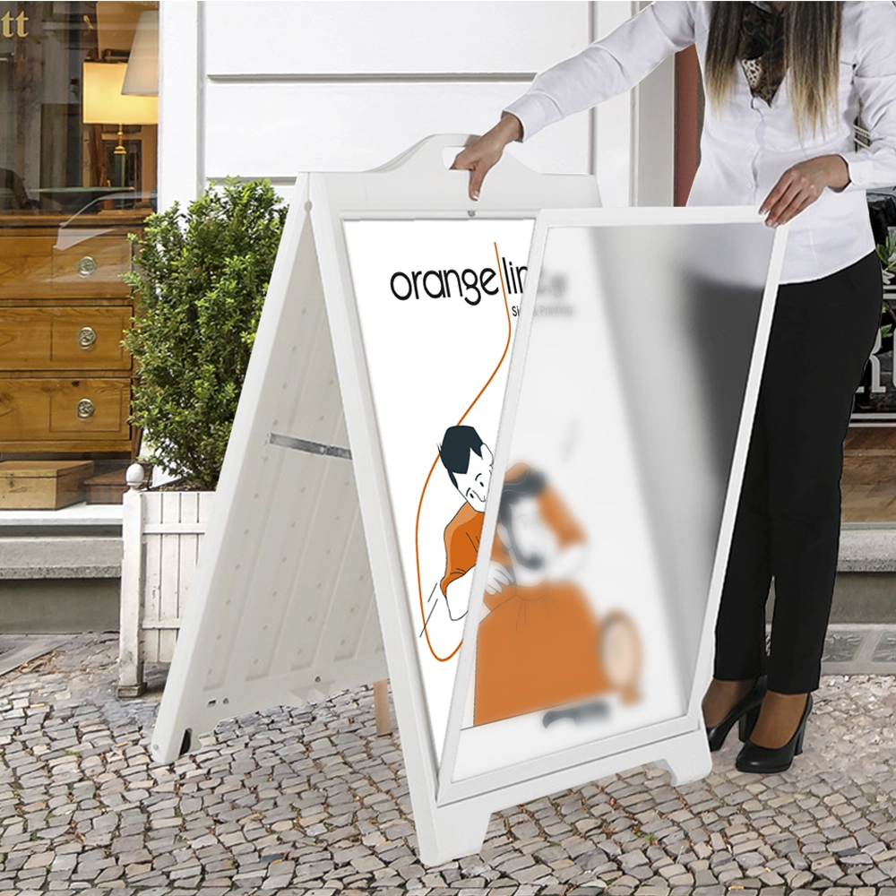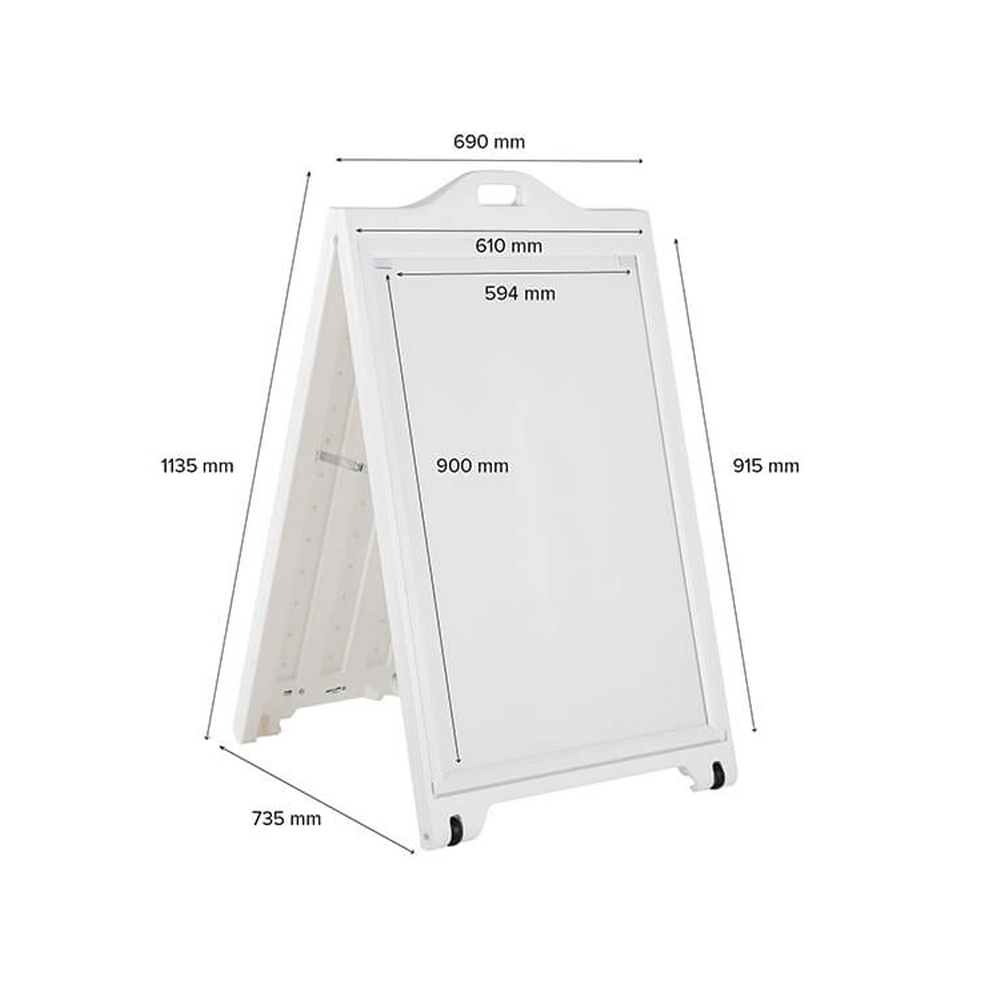 Το A–BOARD pvc σταντ με κορνίζα αλουμινίου είναι κατασκευασμένο από πλαστικό υψηλής ποιότητας HDPE*, είναι διπλής όψεως, πτυσσόμενο, με χειρολαβή και ροδάκια για εύκολη μετακίνηση. Aνθεκτικό, στιβαρό κατάλληλο για εκτεταμένη χρήση σε εξωτερικούς χώρους και σε αντίξοες καιρικές συνθήκες. Για την προστασία της εκτύπωσης διαθέτει κάλυμμα από κορνίζα αλουμινίου με αντιθαμβωτική διαφάνεια PET. Η εκτύπωση γίνεται επάνω σε μουσαμά, για την σταθερή τοποθέτηση της εκτύπωσης υπάρχει κολλητική ταινία (επαναχρησιμοποιούμενη μέχρι 100 φορές) που επιτρέπει και την εύκολη αλλαγή εκτύπωσης. Όταν δεν χρησιμοποιείται, διπλώνει για πιο άνετη αποθήκευση.
