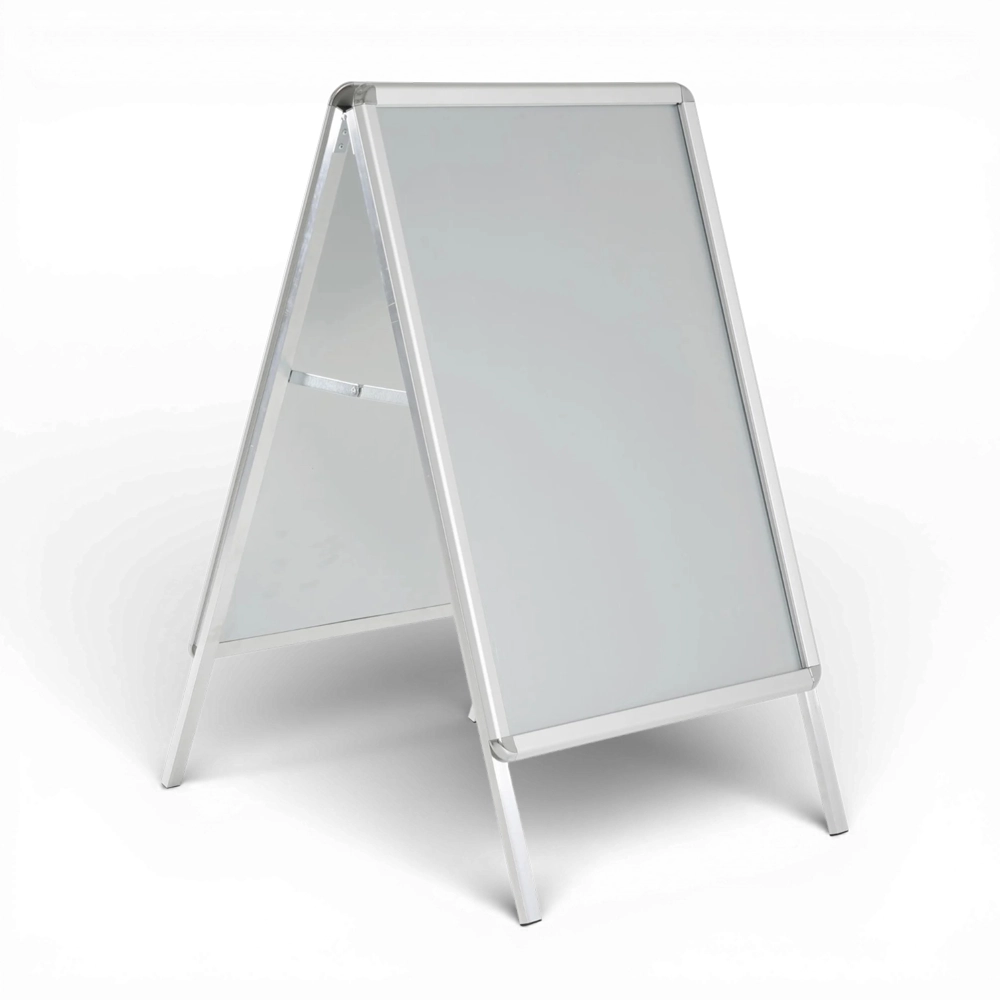 Το A–BOARD σταντ από ανοδιωμένο προφίλ αλουμινίου είναι κατάλληλο για προβολή σε εσωτερικούς και εξωτερικούς χώρους. Είναι ανθεκτικό, στιβαρό και πτυσσόμενο. Η αφίσα αλλάζει εύκολα χάρη στη μεταλλική ανοιγόμενη κορνίζα (snap frame) πάχους 32mm. Διαθέτει αντιθαμβωτικό διάφανο ματ κάλυμμα από PVC όπου προστατεύει την αφίσα και προσφέρει υψηλή αντοχή σε εξωτερικές συνθήκες και στην υπεριώδη ακτινοβολία. Η εκτύπωση είναι επάνω σε μουσαμά αδιάβροχο και τυπώνεται σε υψηλής ανάλυσης εκτυπωτικό μηχάνημα.