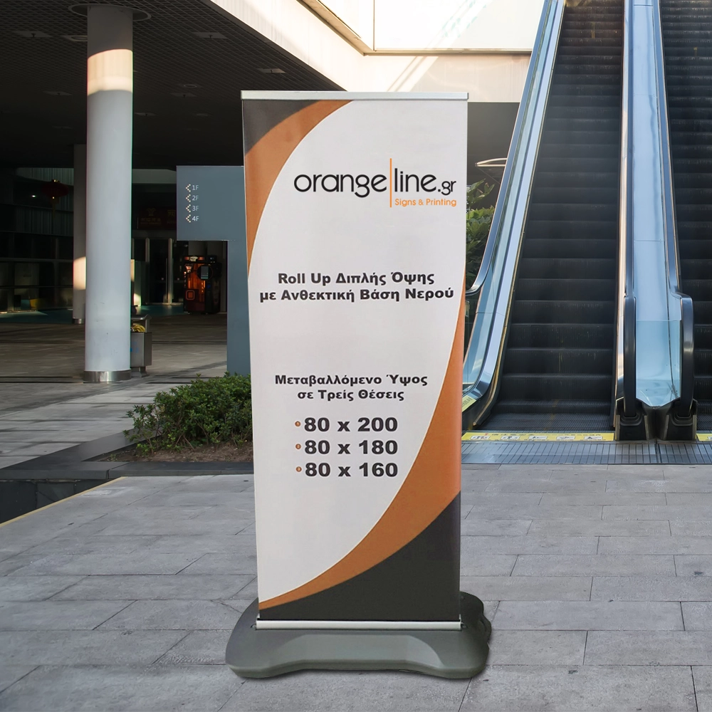 Το Roll up με βάση νερού είναι το πιο ιδανικό για εξωτερικούς χώρους, event, κ.α. έχει στιβαρή κατασκευή με δύο σωλήνες για ασφαλή στήριξη και φαρδιά βάση νερού με ροδάκια για εύκολη μεταφορά. Το ύψος του είναι Ρυθμιζόμενο σε τρεις θέσεις 1,60m | 1,80m | 2,00m ενώ το πλάτος παραμένει σταθερό στα 0,80cm. Το βάρος του είναι 18kg. Tυπώνεται σε υψηλής ανάλυσης εκτυπωτικό μηχάνημα.