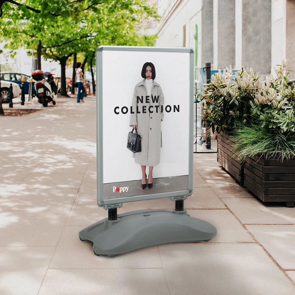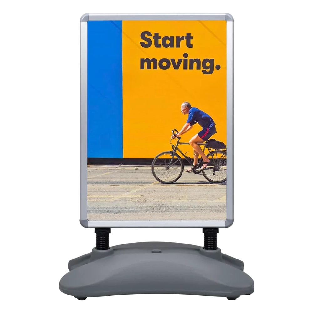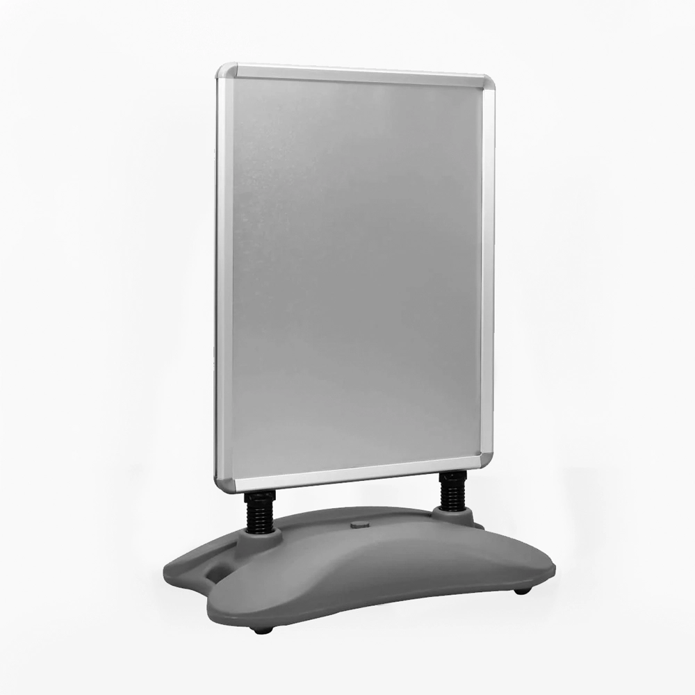 Το stand με ελατήρια είναι η καλύτερη επιλογή για εξωτερικό χώρο, κατασκευασμένο από στιβαρό αλουμίνιο, με δύο όψεις προβολή. Η βάση από πλαστικό βαρέως τύπου γεμίζει με νερό ή άμμο εξασφαλίζοντας επιπλέον βάρος και σταθερότητα διαθέτει ελατήρια για μέγιστη αντοχή στον αέρα. Είναι εύκολη στη μεταφορά χάρη στους τροχούς και τη λαβή της βάσης. Η διαφανής μεμβράνη από PVC με φίλτρο UV προστατεύει την εκτύπωση από το ηλιακό φως. Η κορνίζα του είναι τύπου snap frame (κλικ) που εξασφαλίζει την εύκολη αλλαγή της αφίσας. Η εκτύπωση γίνεται επάνω σε αδιάβροχο μουσαμά και τυπώνεται σε υψηλής ανάλυσης εκτυπωτικό μηχάνημα.